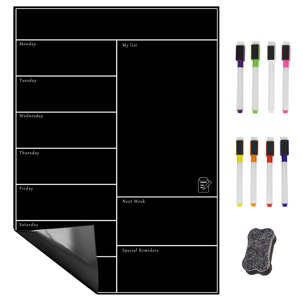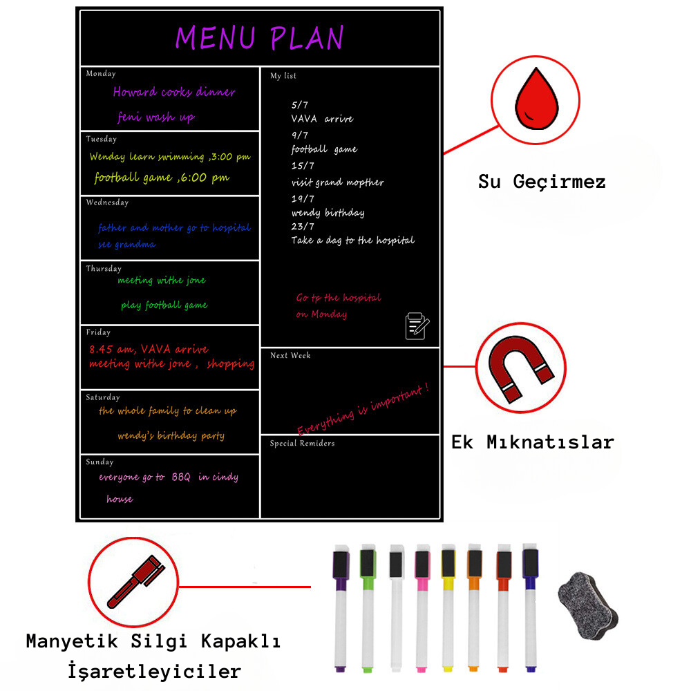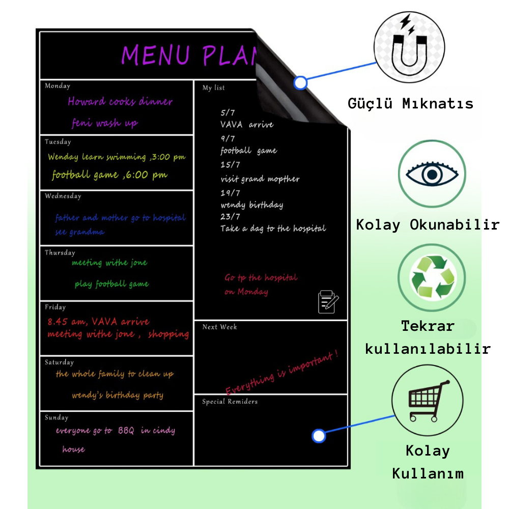 Manyetik hafta planlayıcısını buzdolabınıza veya başka bir metal yüzeye yapıştırabilir ve mutfağa her girdiğinizde kontrol edebilirsiniz.