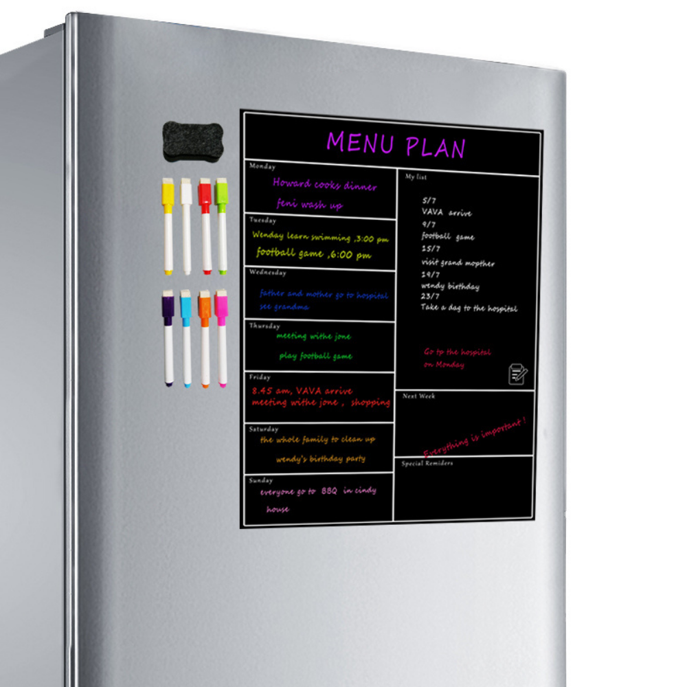 Buzdolabı üzerinde bir hatırlatma, kayıt alışveriş listesi ve haftalık plan olarak kullanılabilir.
