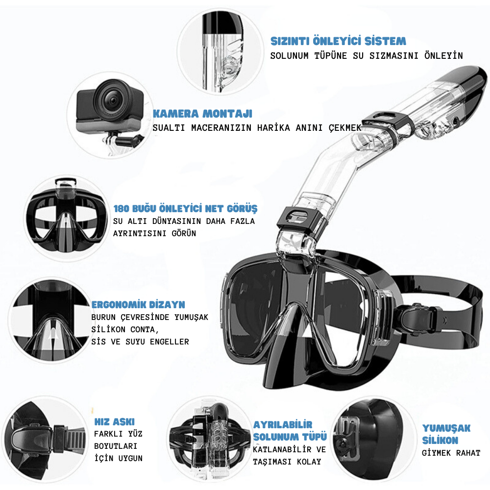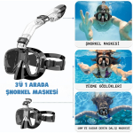 YeniTech-Şnorkel,katlanabilir profesyonel dalış maskesi,kuru üst sistem ve kamera tutuculu, önleyici profesyonel siyah yüzme maskesi